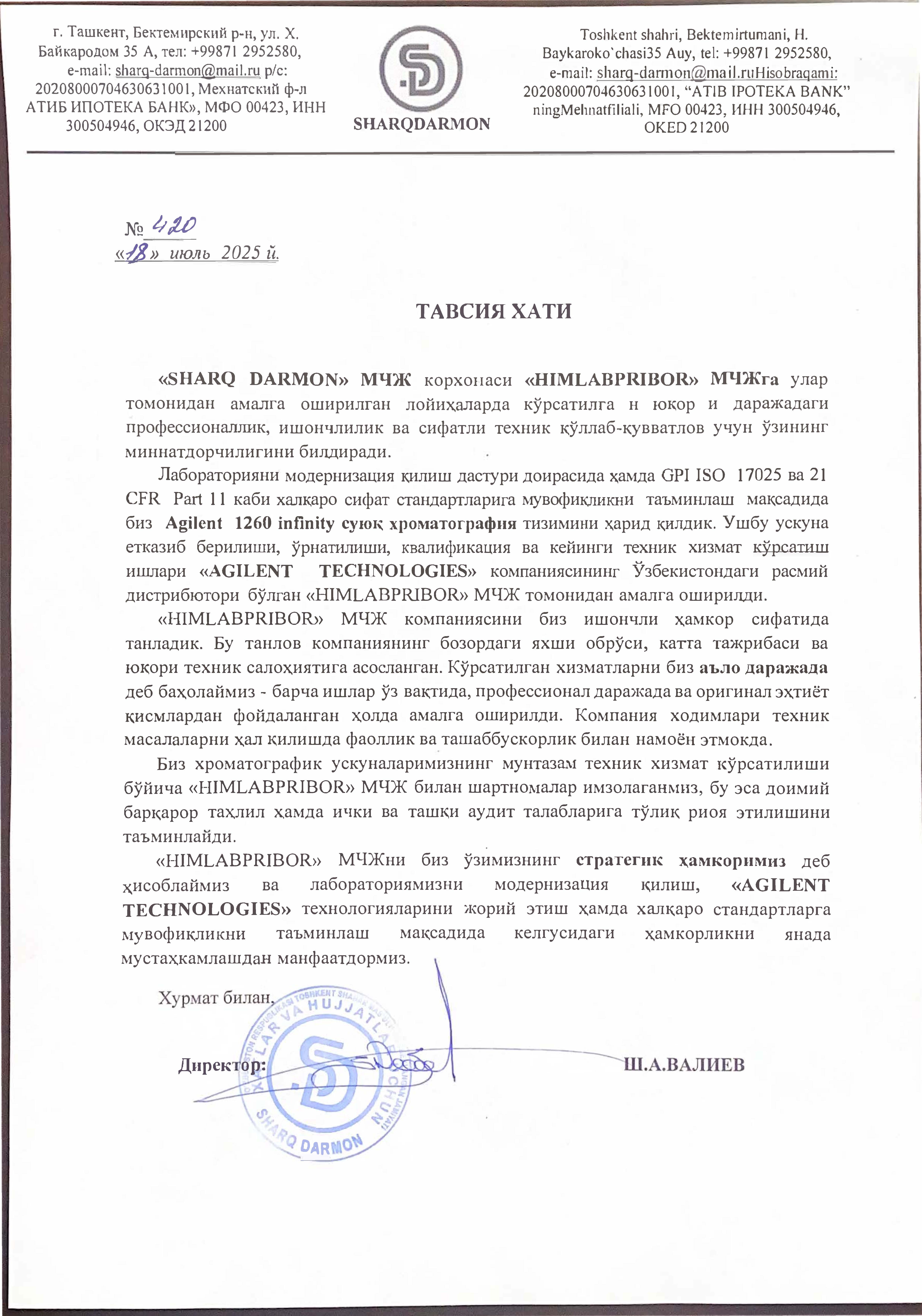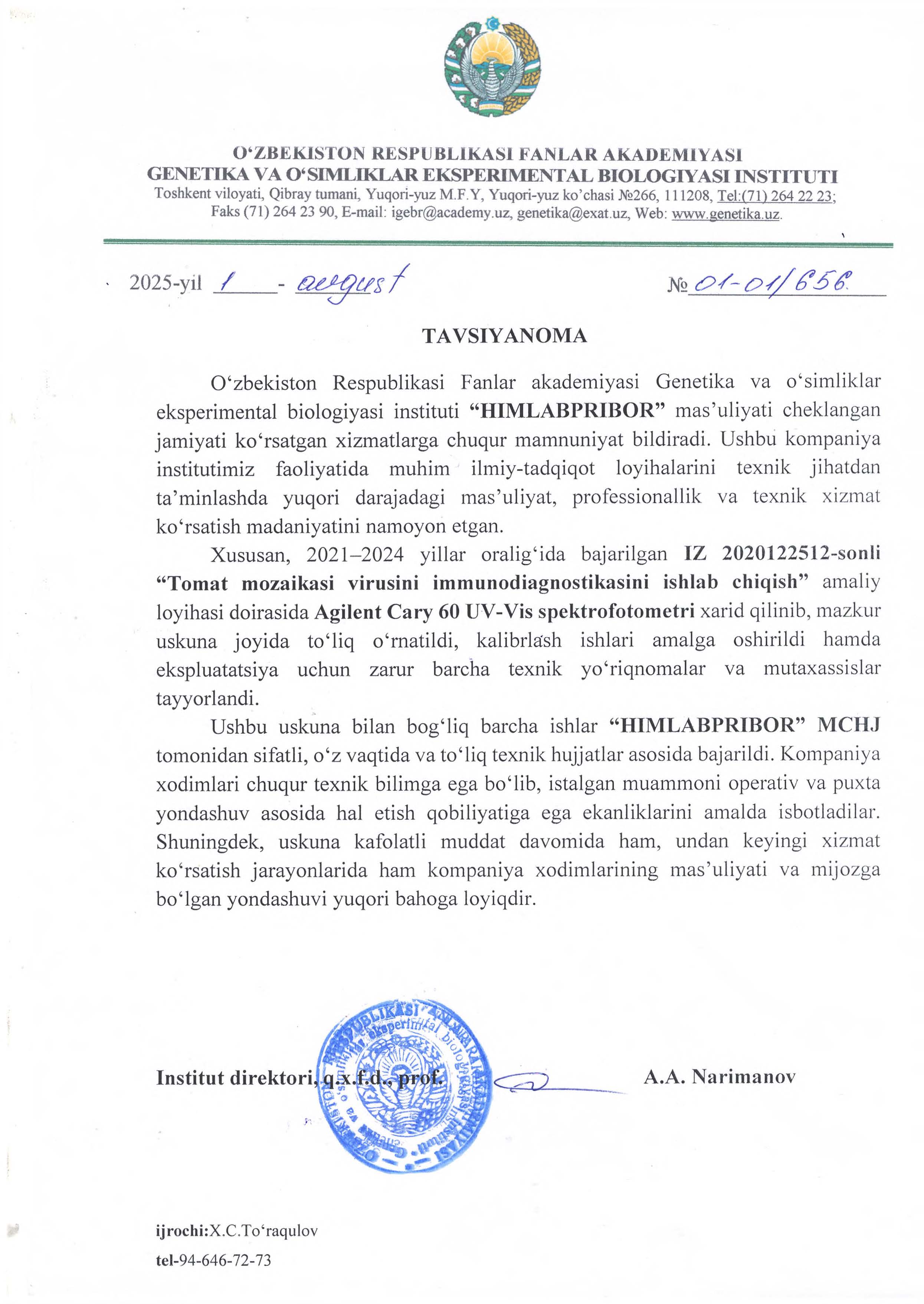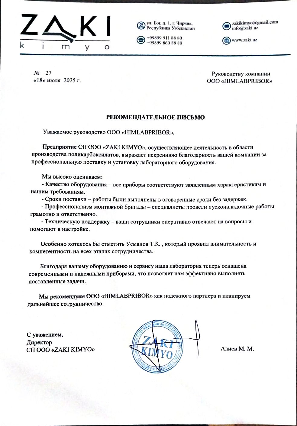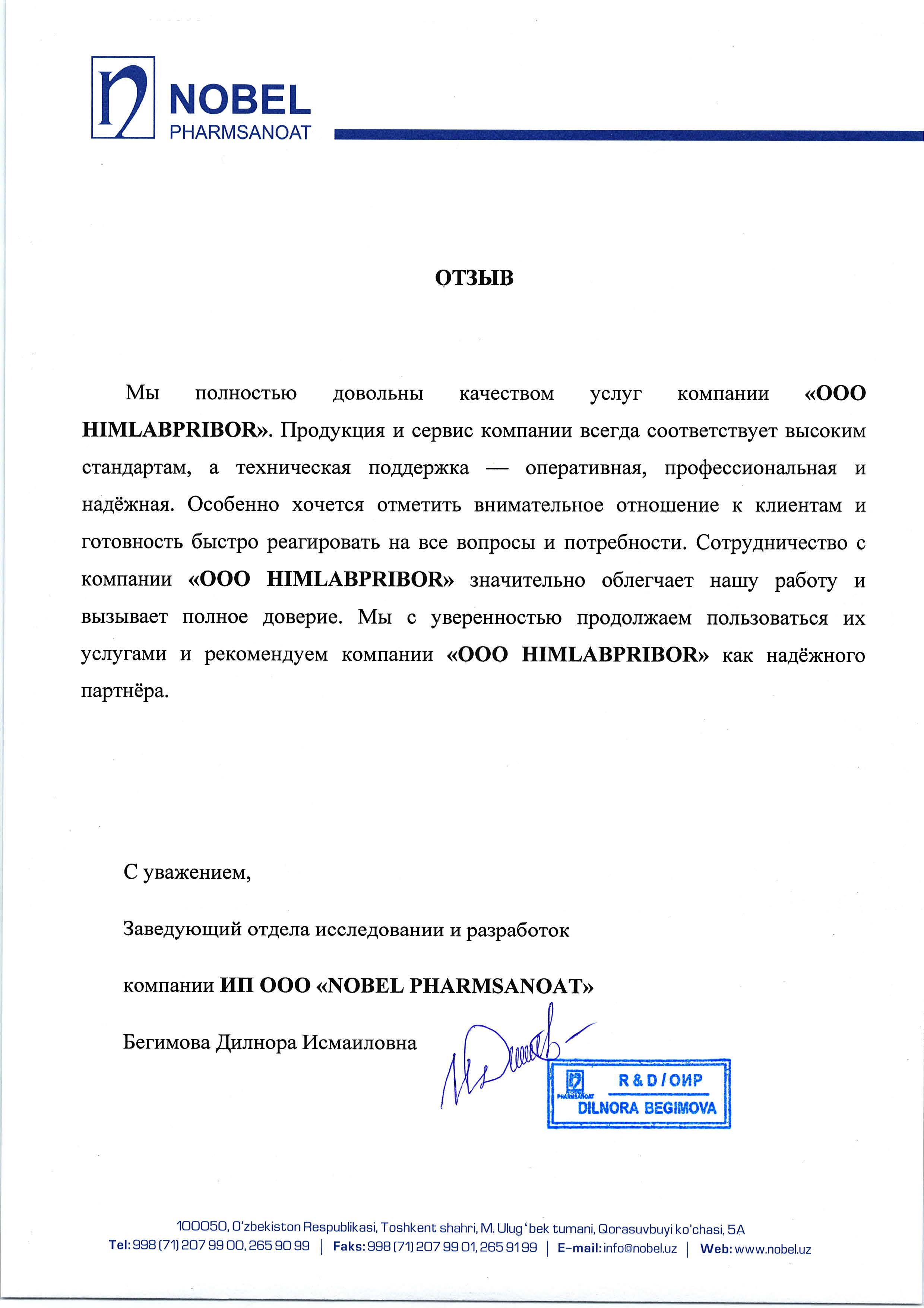 "Universitetimiz laboratoriyasi uchun bir necha marta HIMLABPRIBOR dan uskunalar xarid qilganmiz. Hamisha sifatli mahsulotlar va professional yordam ko'rsatishadi. Ayniqsa, yangi uskunalarni sozlash va ulardan foydalanish bo'yicha berilgan maslahatlar juda foydali bo'ldi. Ishlariga omad tilaymiz!"