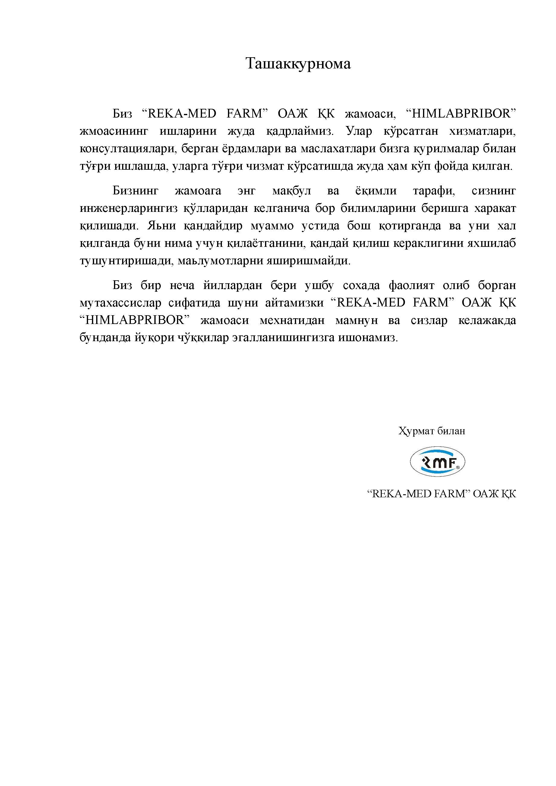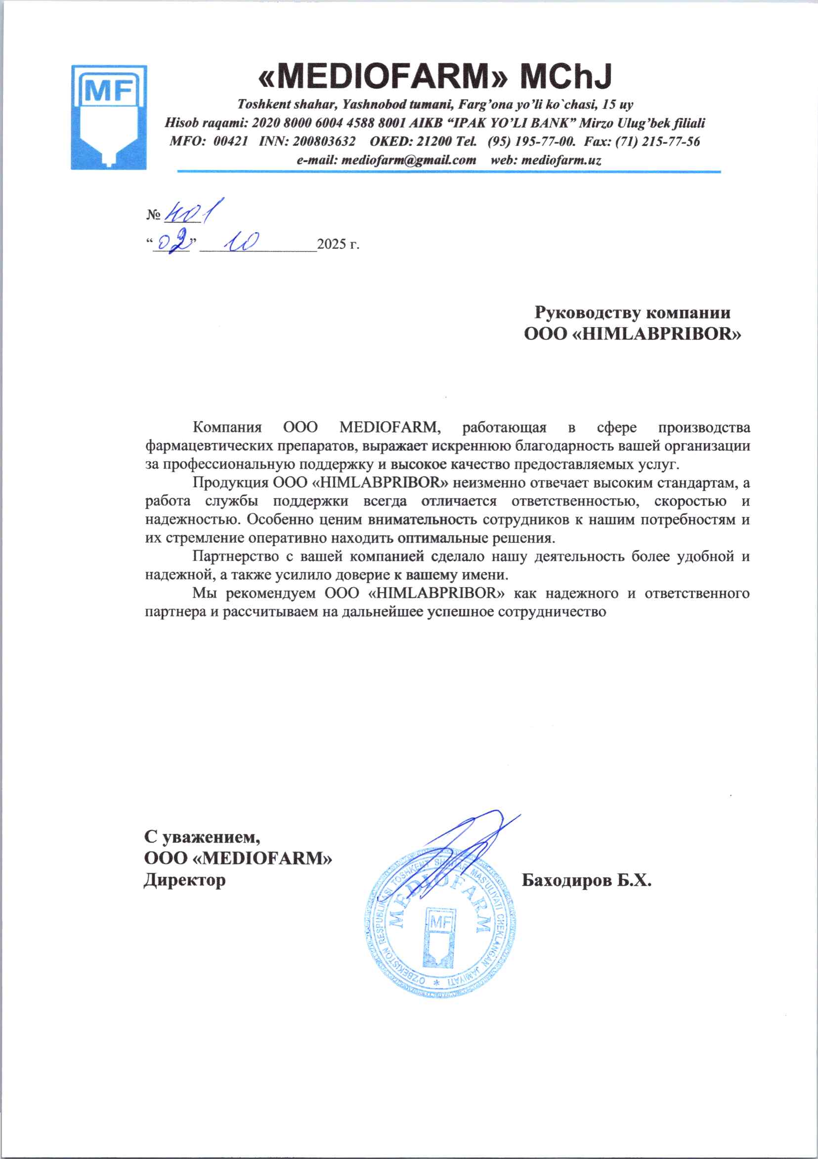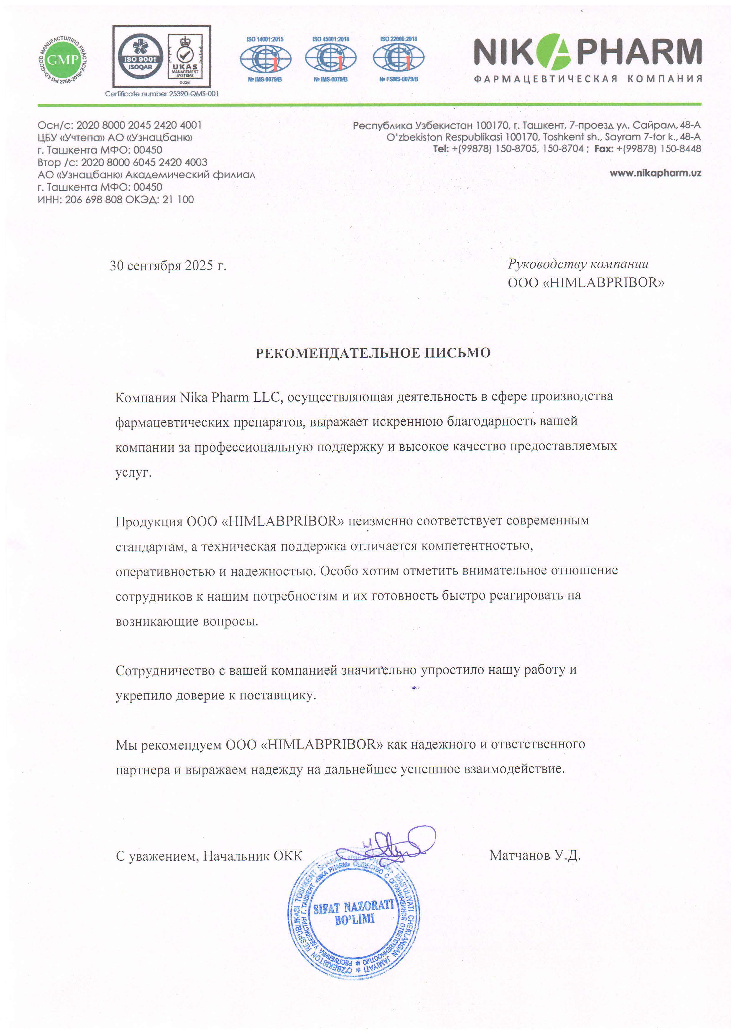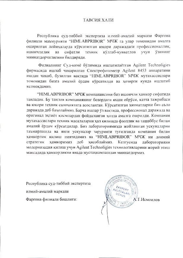 "HIMLABPRIBOR kompaniyasi bilan uzoq yillik hamkorlikdan mamnunmiz. Tibbiy laboratoriyamiz uchun kerakli jihozlarni tez va sifatli yetkazib berishadi. Ayniqsa, sotishdan keyingi xizmat ko'rsatishlari, kafolatli ta'mirlash ishlari va ehtiyot qismlarining doimiy mavjudligi biz uchun juda muhim. Ular har doim muammolarni hal qilishda yordam berishadi."