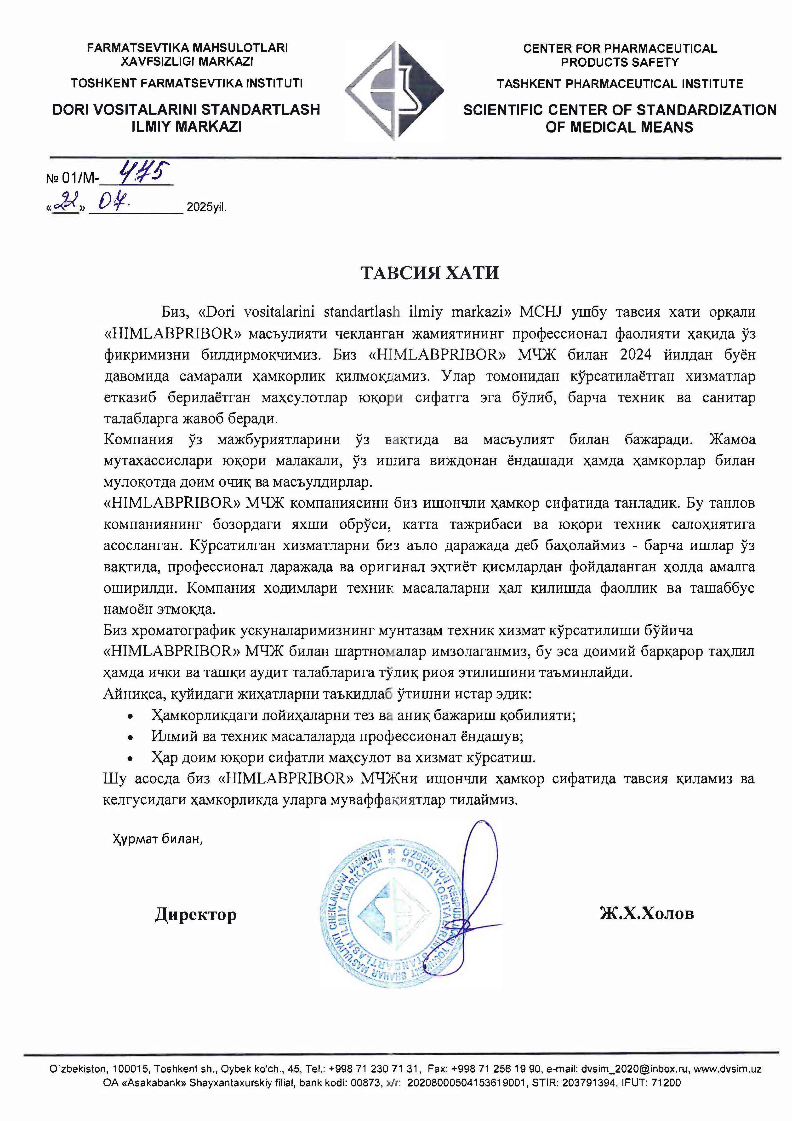 "Bizga doimiy ravishda kimyoviy reaktivlar va sarf materiallari kerak bo'ladi. HIMLABPRIBOR kompaniyasi har doim talabimizni tezda qondiradi va sifatli mahsulotlar yetkazib beradi. Ular bilan ishlash juda qulay va ishonchli. Tavsiya qilamiz!"