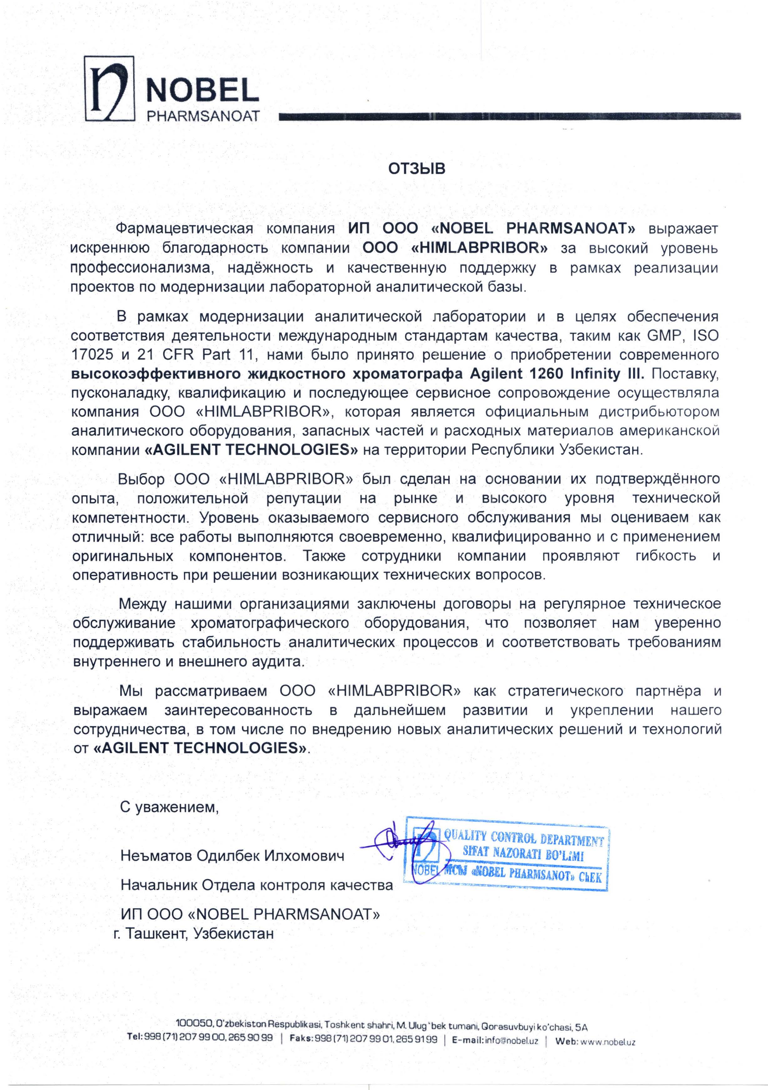 "С HIMLABPRIBOR мы работаем уже более 5 лет, и каждый раз убеждаемся в их профессионализме. Последняя поставка сложного хроматографического оборудования была выполнена точно в срок, а пусконаладка прошла безупречно. Отдельно хочется отметить квалификацию инженеров, которые не только быстро всё установили, но и провели полноценное обучение для наших сотрудников. Очень довольны сотрудничеством!"